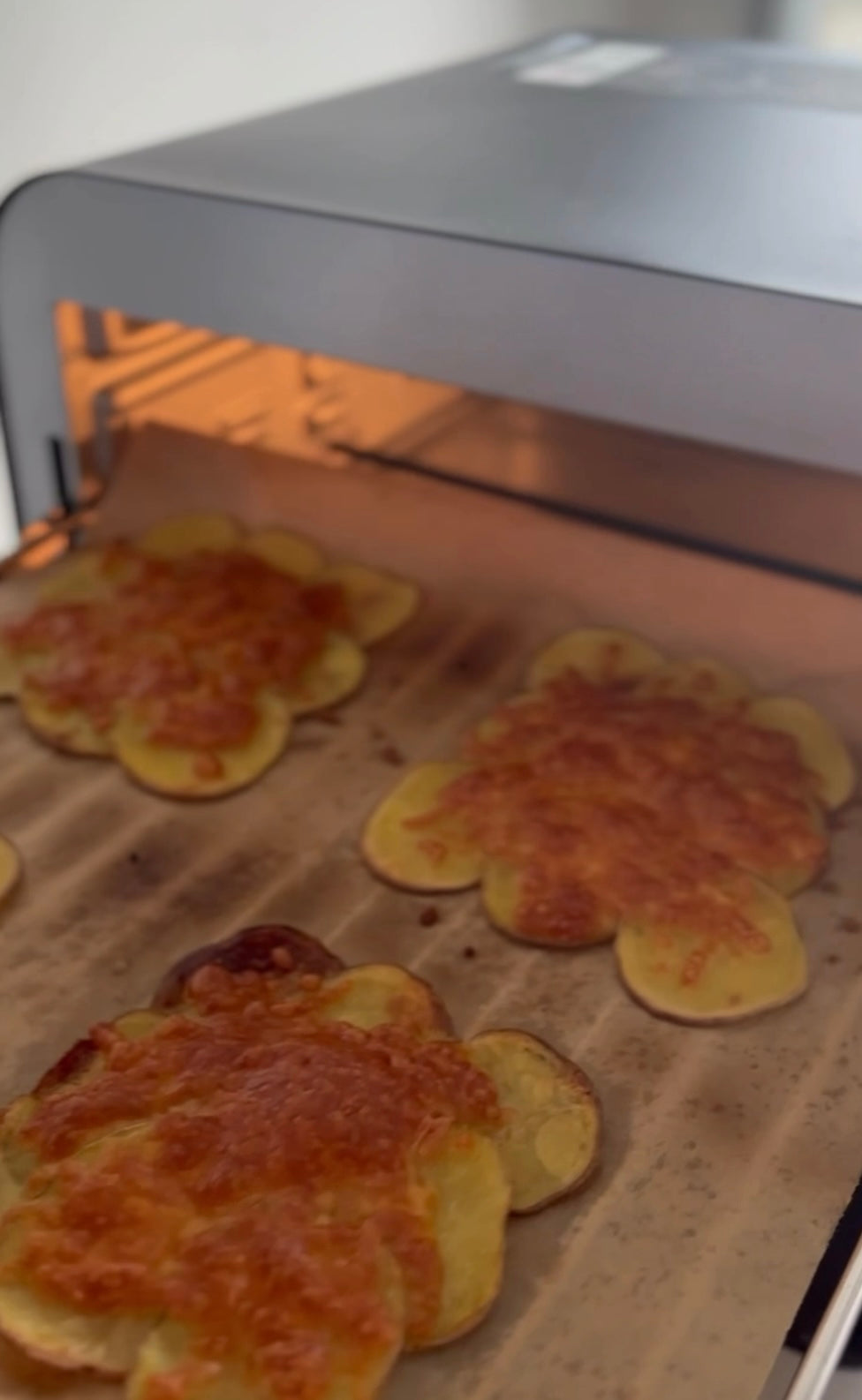- Backen: Die Kartoffel-Quadrate im vorgeheizten Baumfeld-Ofen bei 230 °C für ca. 10 Minuten goldbraun backen.