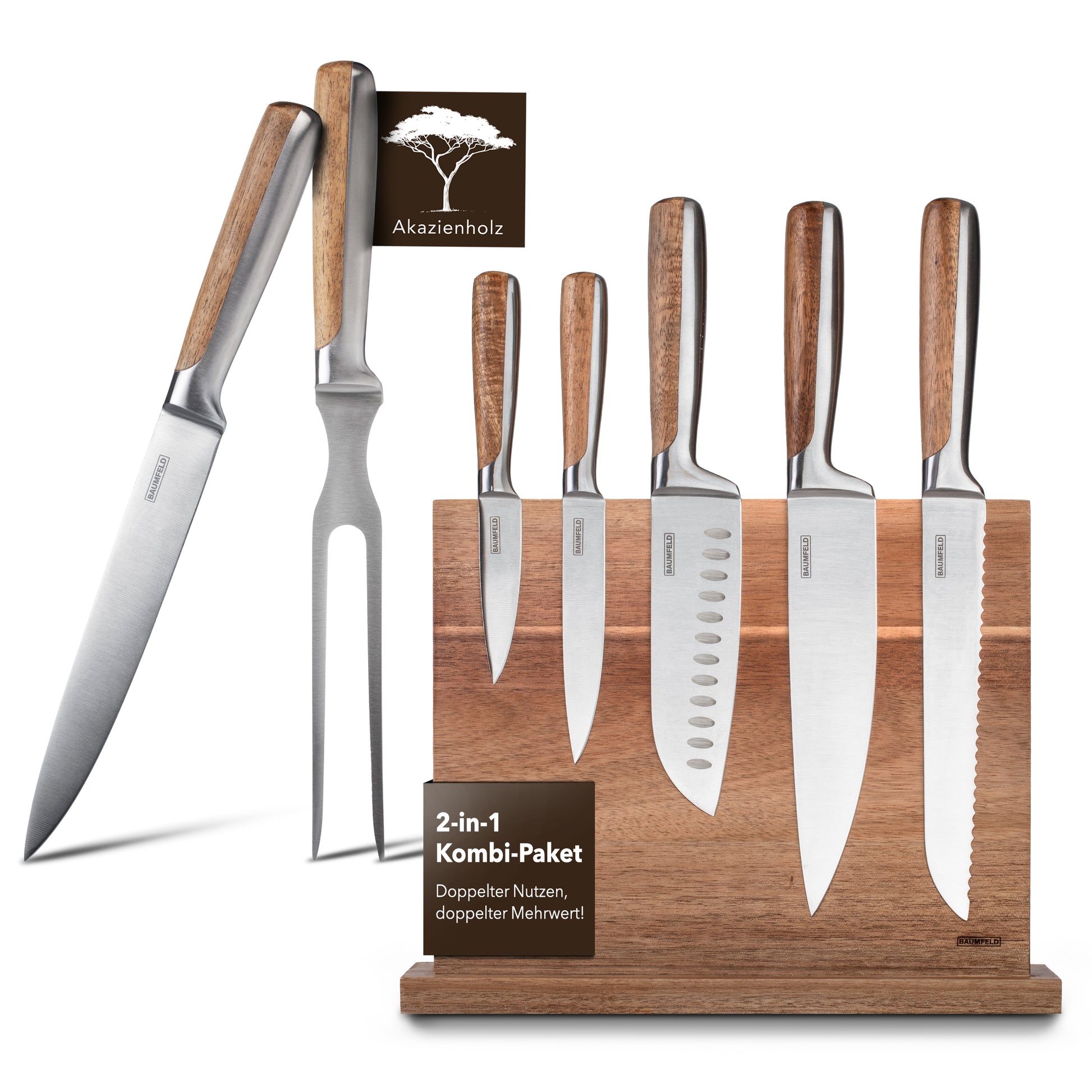 Baumfeld Bundle: 6-teiliges Messerblock-Set und 2-teiliges Tranchierbesteck, Silber, Edelstahlmesser mit Akazienholzgriffen