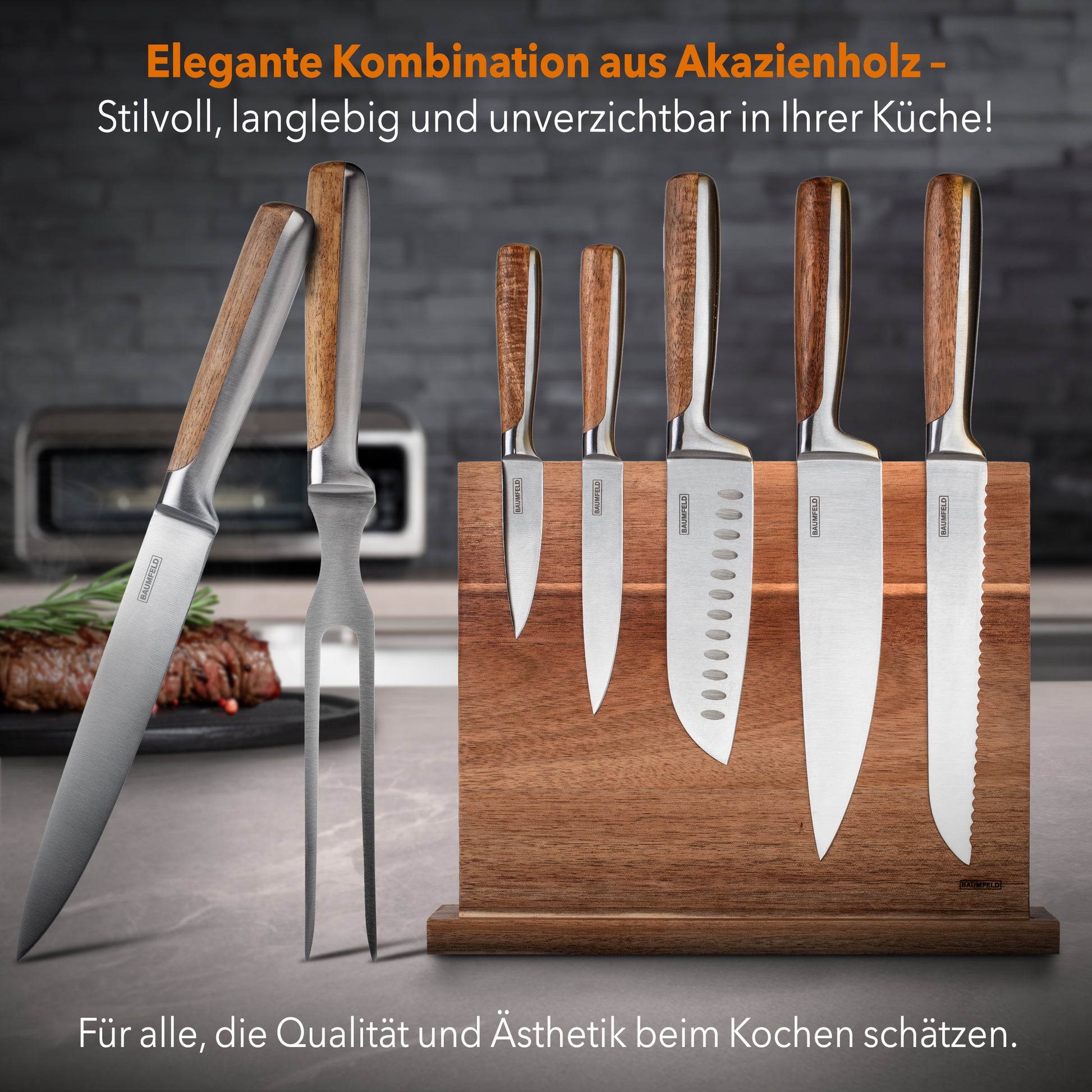 Für stilbewusste Genießer: Messerblock und Tranchierbesteck gehören zur gleichen Serie und ergänzen sich optisch perfekt. Die Edelstahlklingen und die Akazienholzgriffe schaffen ein einheitliches, hochwertiges Design, das Ihre Küche aufwertet.