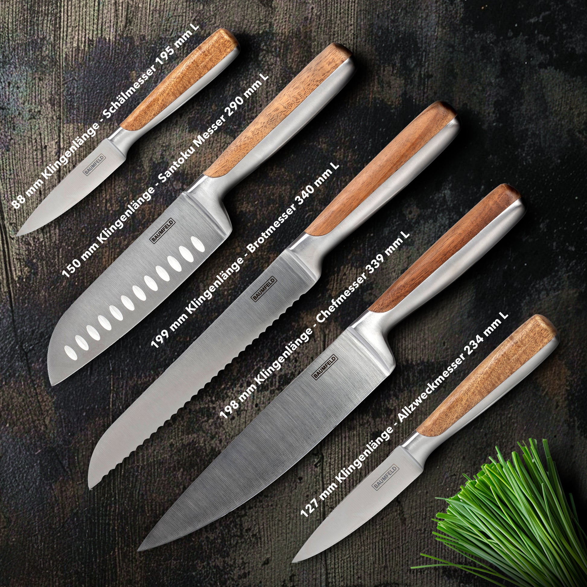 Inhalt: 5 Messer (Chef-, Brot-, Santoku-, Allzweck- und Schälmesser)