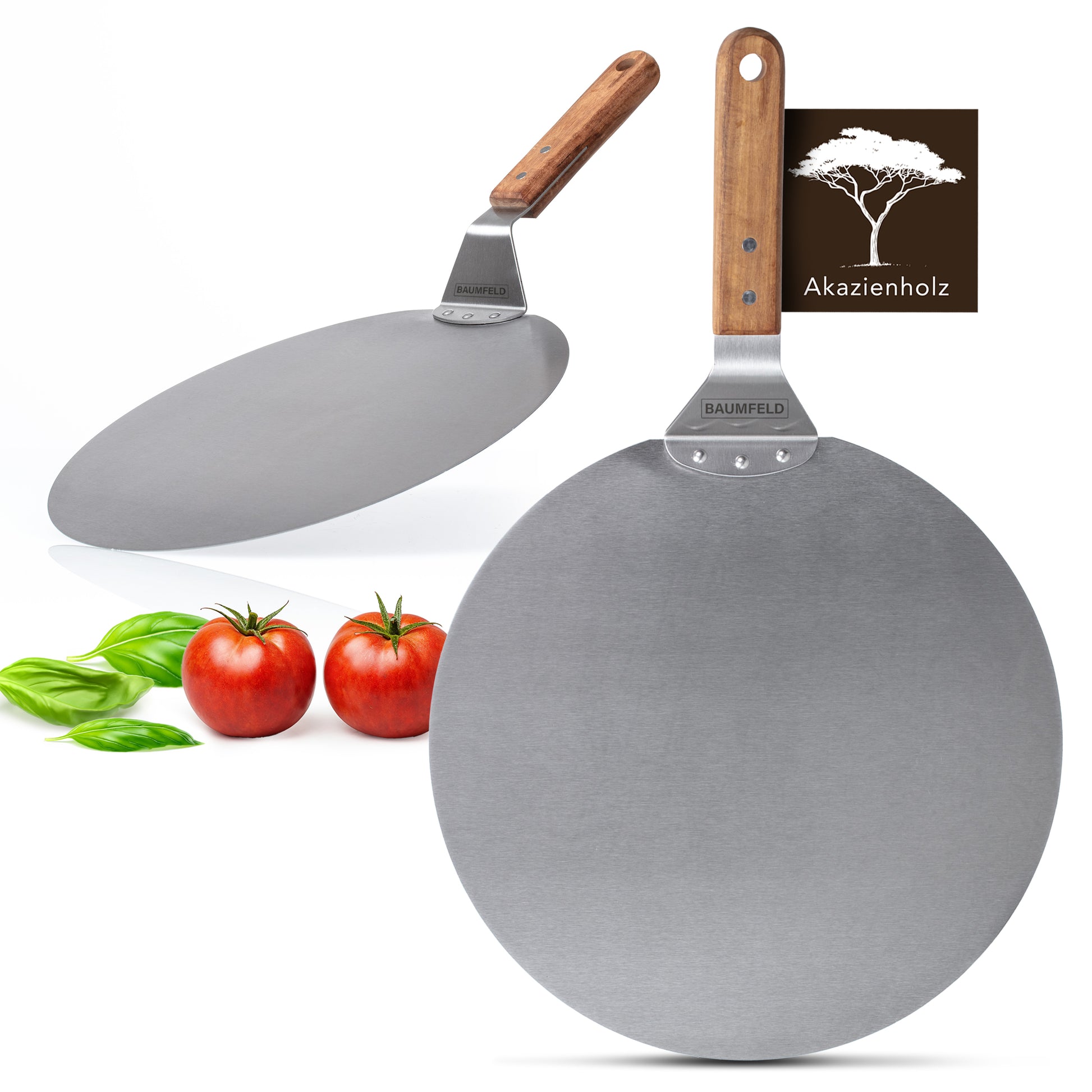 Baumfeld Pizzaschieber Pizzaschaufel, rund, 30 cm Durchmesser, hochwertig aus robustem Edelstahl, stabiler Griff aus natürlichem Akazienholz, Brotschieber, Pizza Zubehör